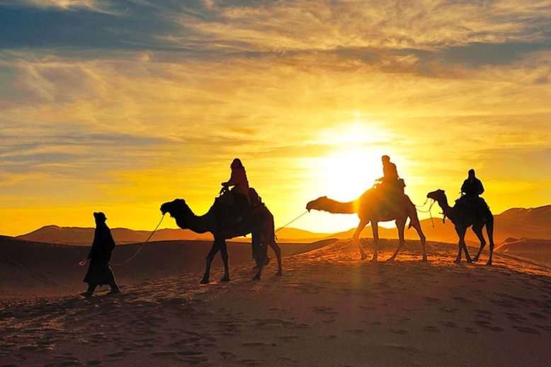 Arabian horses trot back and forth and, the ubiquitous camel appears.