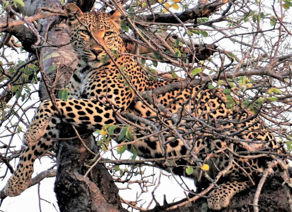 From the safety of our Land Cruiser we watched the leopard staring down at us disdainfully, from where it lay stretched out on the branches of a marula tree. It had just finished devouring its kill, letting the remains drop to the ground where they were quickly snatched up by scavenging hyenas.
