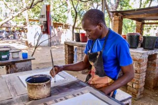 He stops to chat with Mambwe Ngoma, Head of Painting, another Tribal Textiles veteran who's stirring a pot of red paint.