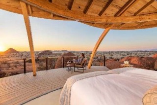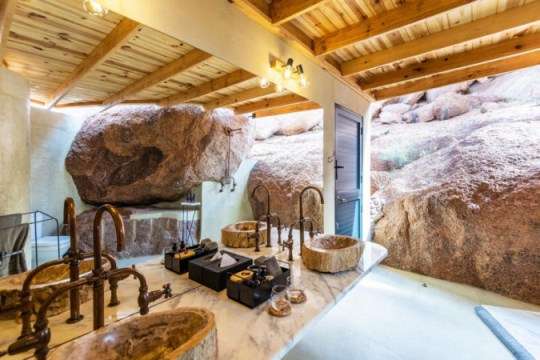 It is built at the base of two granite outcrops connected by a bridge, which allows stunning views of Namibia's highest mountain, the Brandberg, to the south and the dispersed cathedral-like granite landscape to the north.